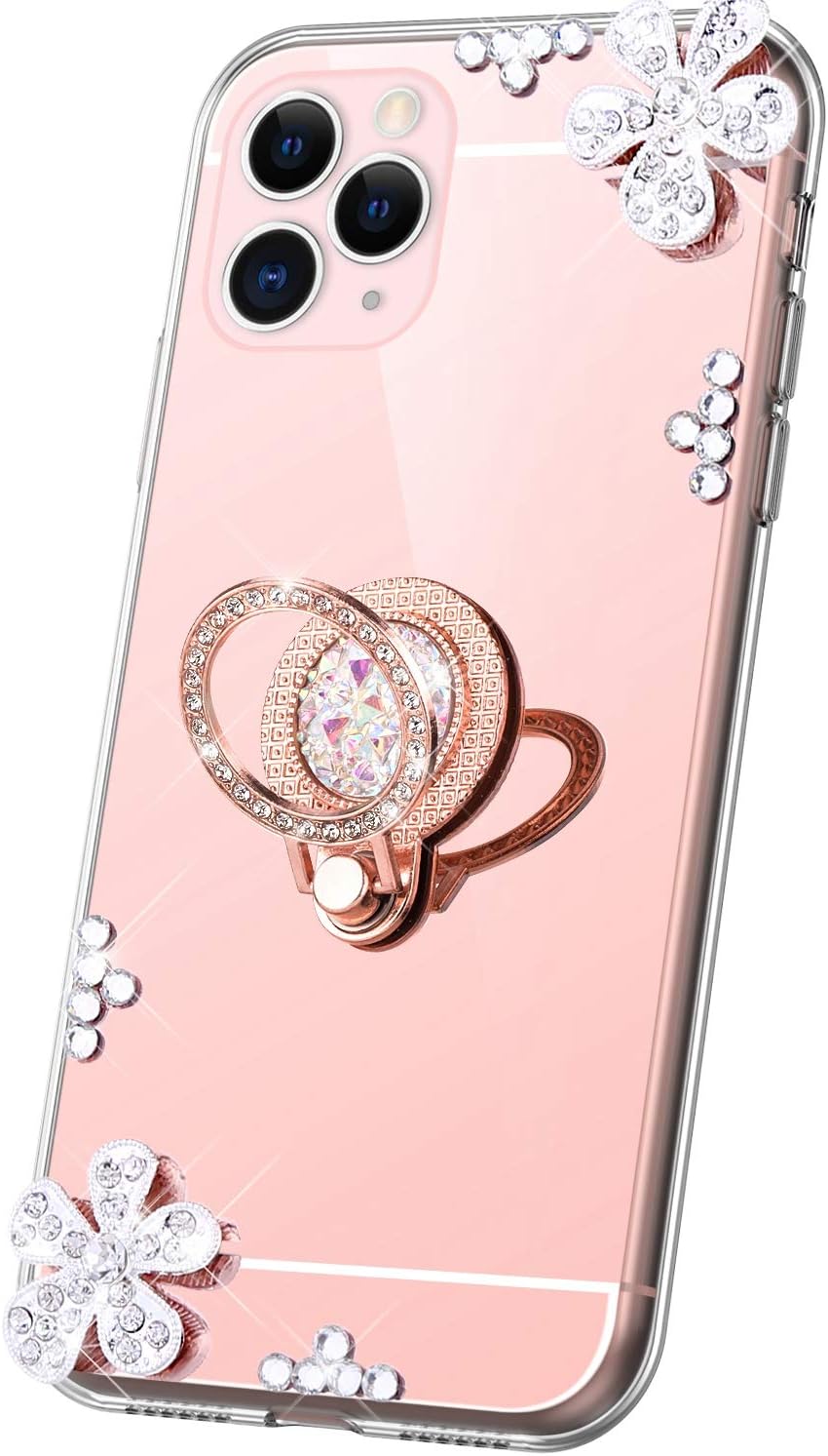 Amazon Com Phezen Case For Iphone 11 Pro Max Bling Glitter Rhinestone Mirror Makeup Case Diamond Crystal Flower Soft Tpu Silicone Rubber Bumper Protective Case Ring Holder Stand For Iphone 11 Pro Max Rose Gold