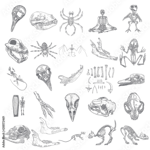 Magic Animal Bones Design Elements Set Hand Drawn Sketch For Magician Collection Witchcraft Spell Symbols Bird Raven Chicken Wolf Or Dog Jaw Vampire Bat Rat Or Mouse Spider Skeleton Vector Vector